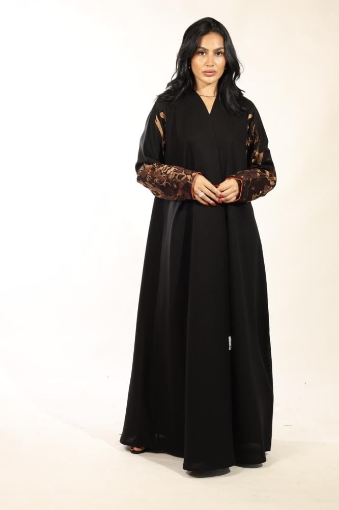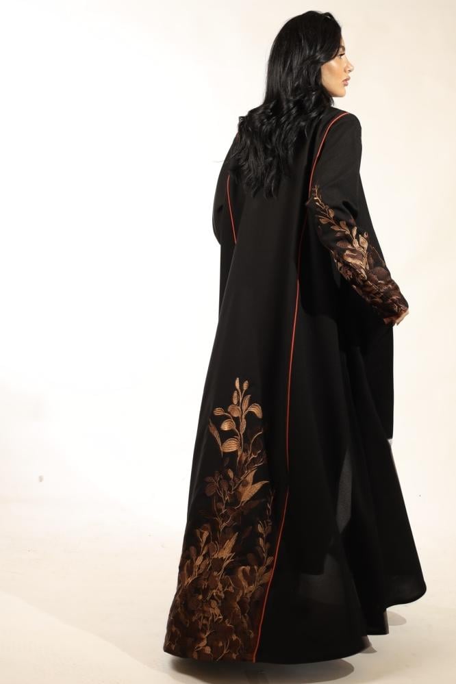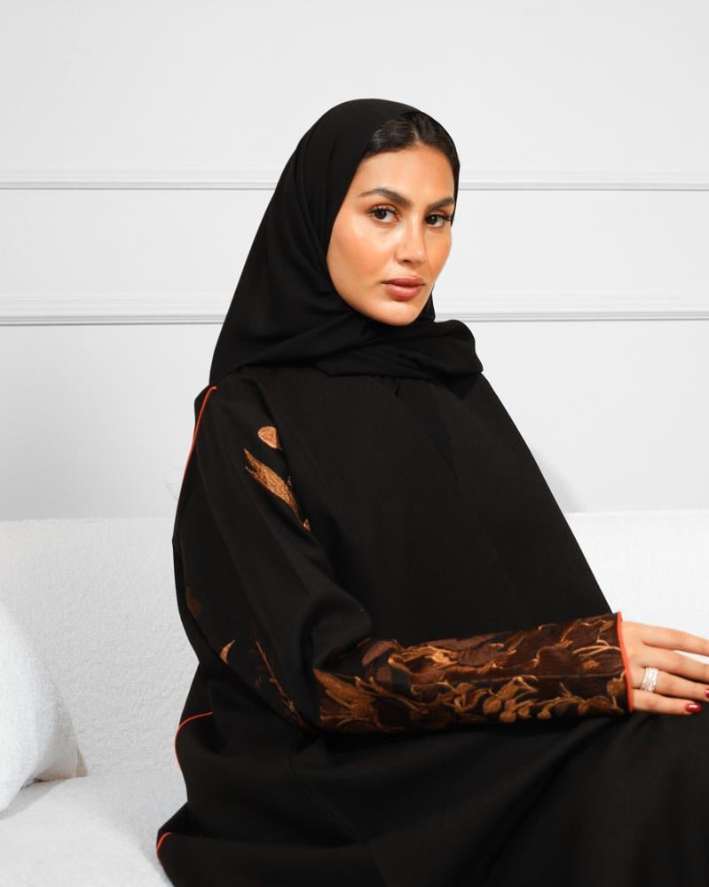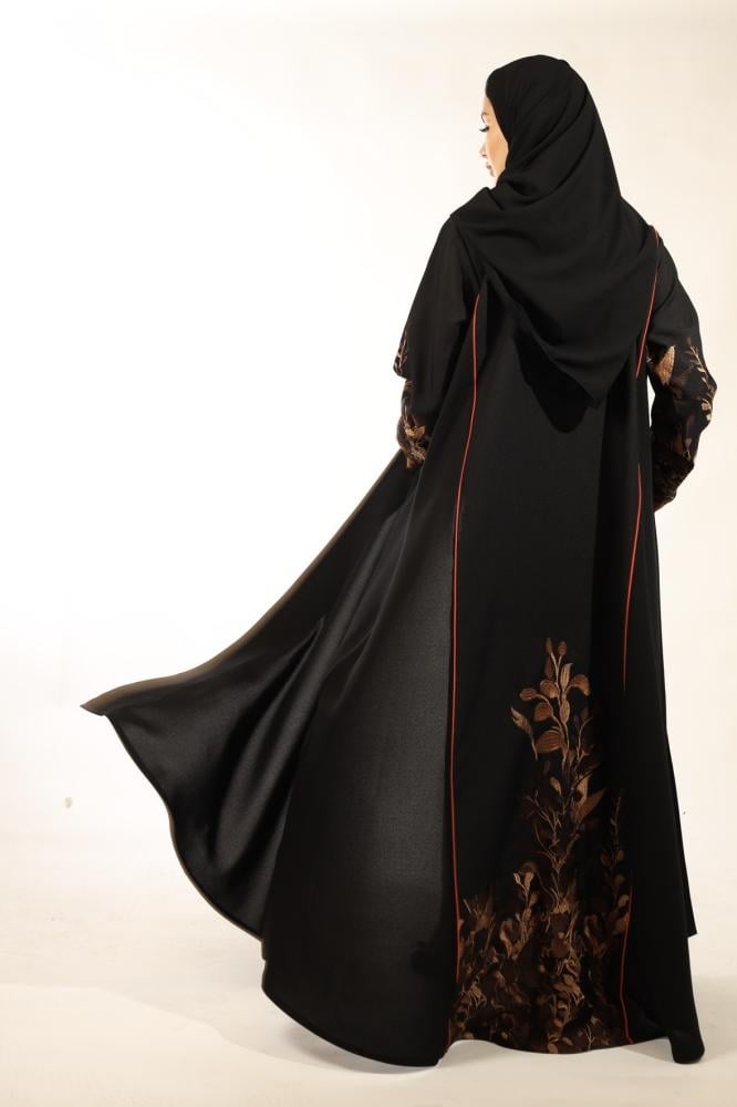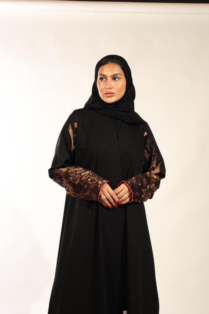 عباية صيفية باللون الاسود مصممة بقماش كتان وتطريز خلفي كمبيوتر ، بموديل أكمام مرتبة وملونه