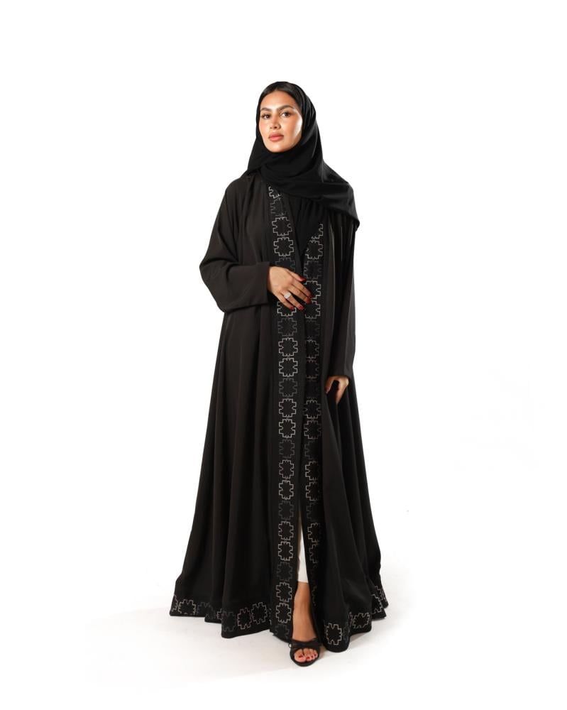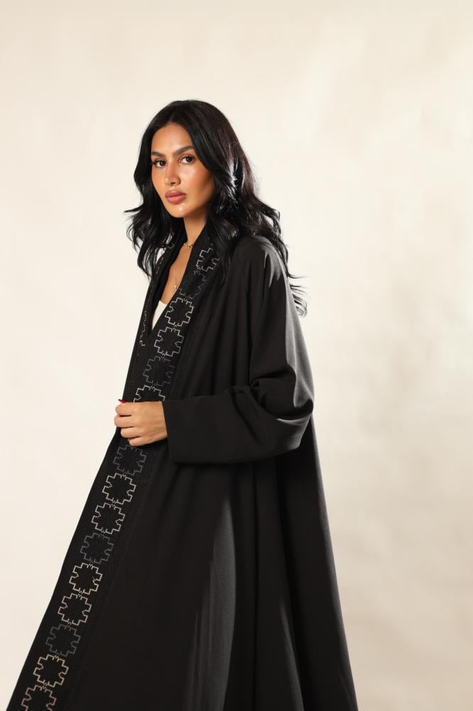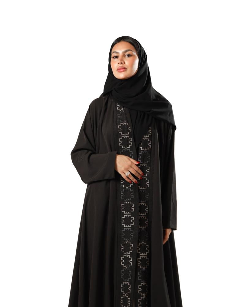 عباية صيفية باللون الاسود مصممة بقماش كريب اوكراني تطريز كمبيوتر ، بموديل أكمام مرتبة